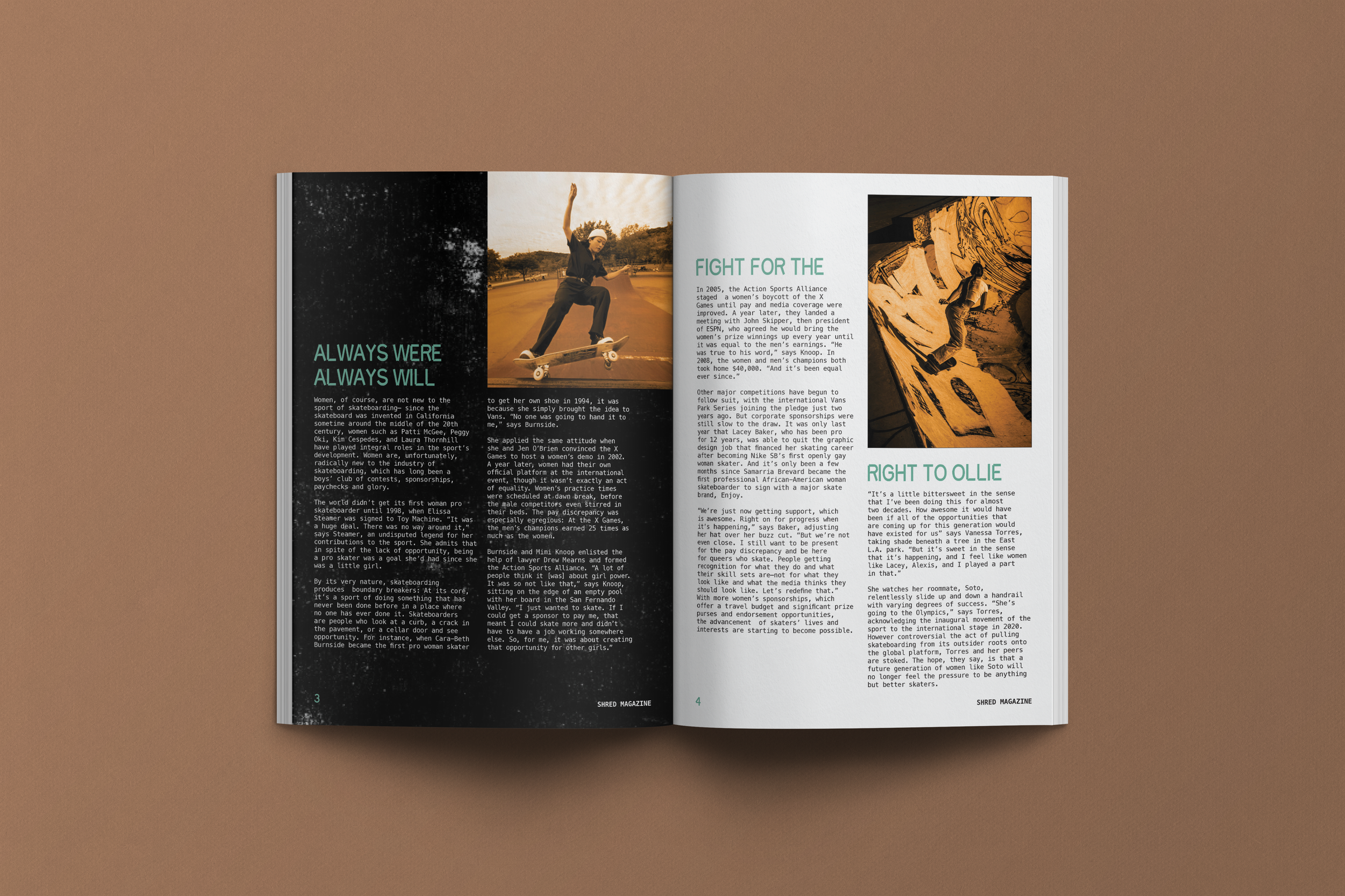 Shred is an empowering, raw, and edgy magazine targeted at major skateboard fanatics. Its ethos and articles are about the true grit and inclusivity of the sport, leading to a major editorial feature in this current issue — Chick Flip — that celebrates the history and accomplishments of female skateboarders.
